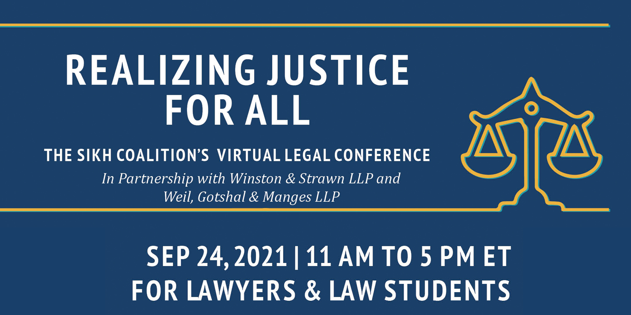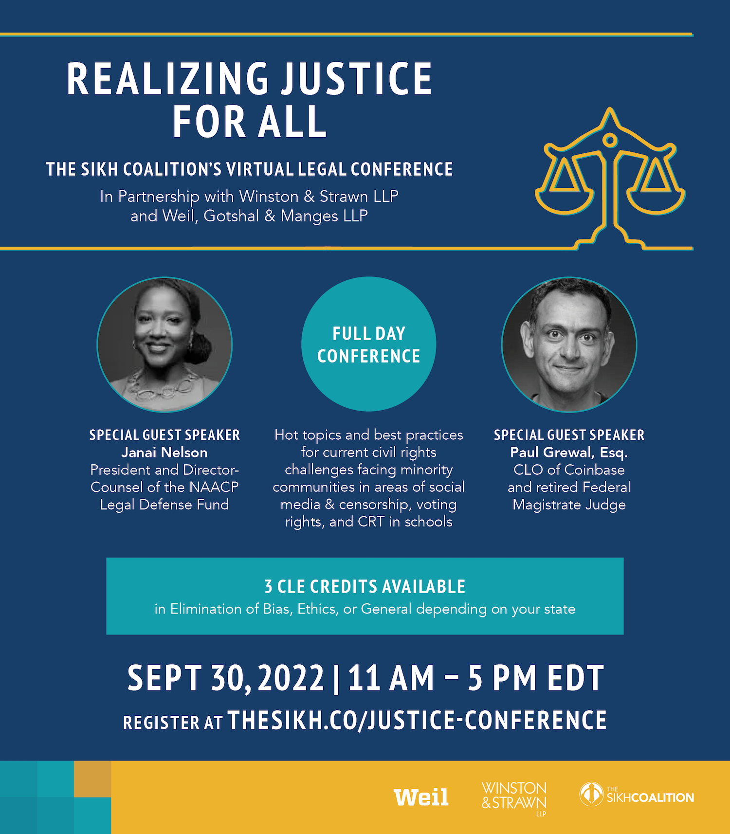 The Sikh Coalition is excited to host our annual virtual legal conference, Realizing Justice For All, on September 30, 2022. Hosted in partnership with law firms Winston & Strawn LLP and Weil, Gotshal, & Manges LLP, this conference offers an opportunity for lawyers and law students to gain CLE accreditation while learning about the core […]